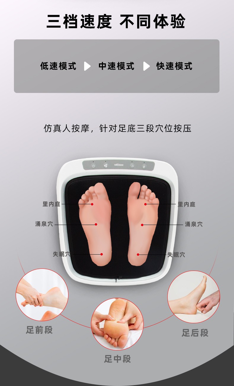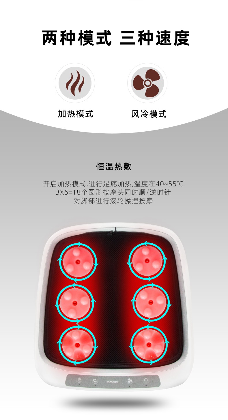 功能特征:腳底六個按摩頭,三檔力度調(diào)節(jié),按摩頭正反轉(zhuǎn)/紅綠燈轉(zhuǎn)換,按摩頭加熱,冷風(fēng)降溫,15分鐘定時,可拆洗腳套,按鍵控制面板