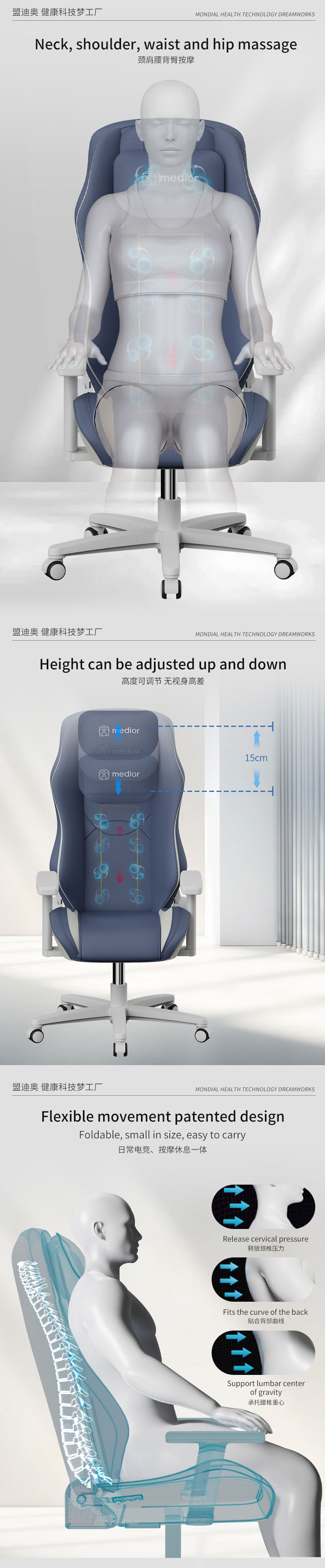 頸部揉捏按摩功能并能順時(shí)針和逆時(shí)針兩個(gè)方向旋轉(zhuǎn)頸部上下高度可調(diào),以適應(yīng)不同使用者的身高。